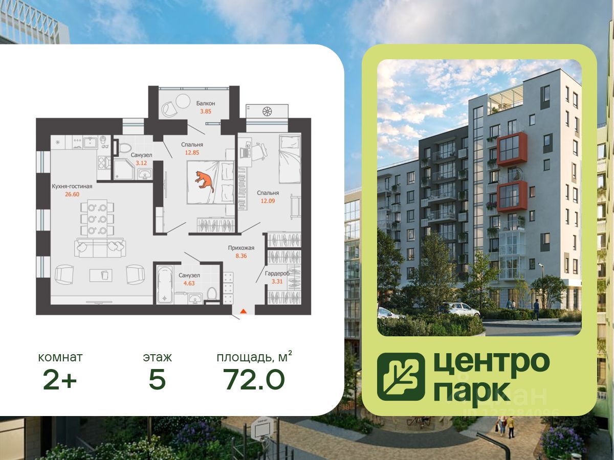 В продаже 2-комнатная квартира площадью 72.00 кв. м, расположенная в новом жилом комплексе комфорт-класса "Центропарк". Комплекс от федерального девелопера "Железно" находится в районе Тулака - географическом центре Волгограда.