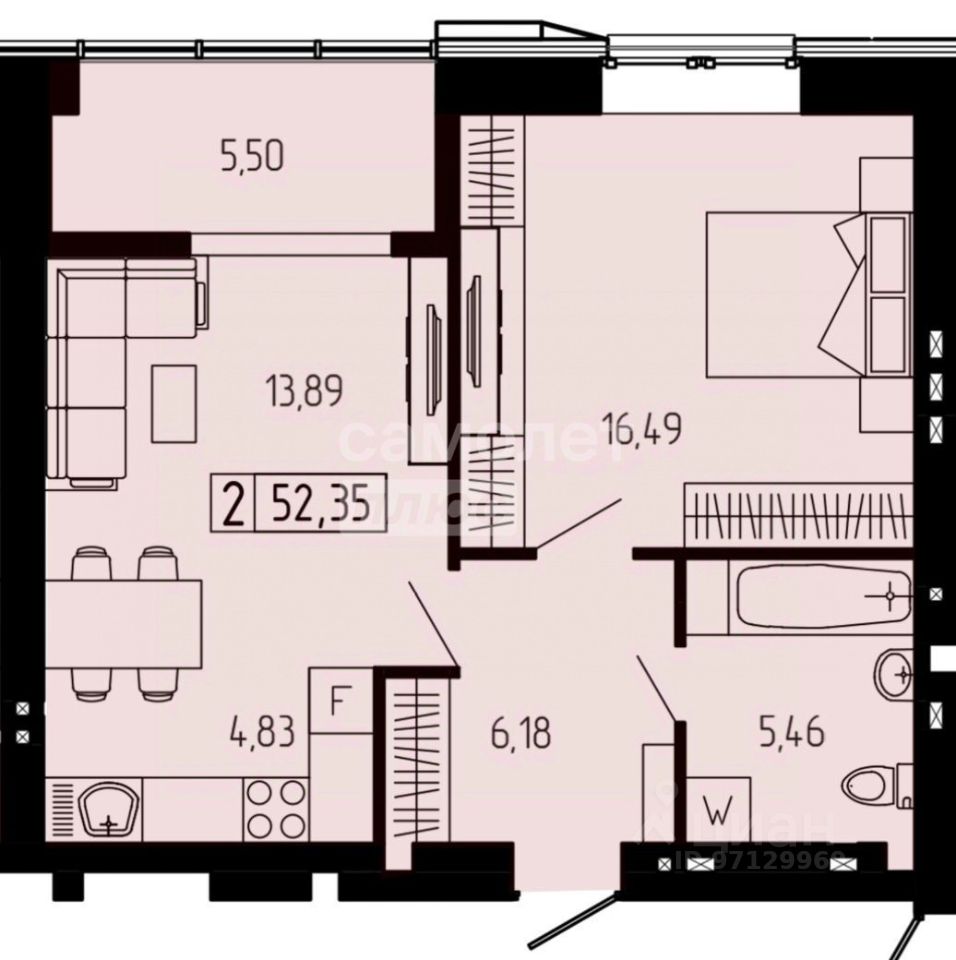 Общaя площадь - 52,35 кв.м.