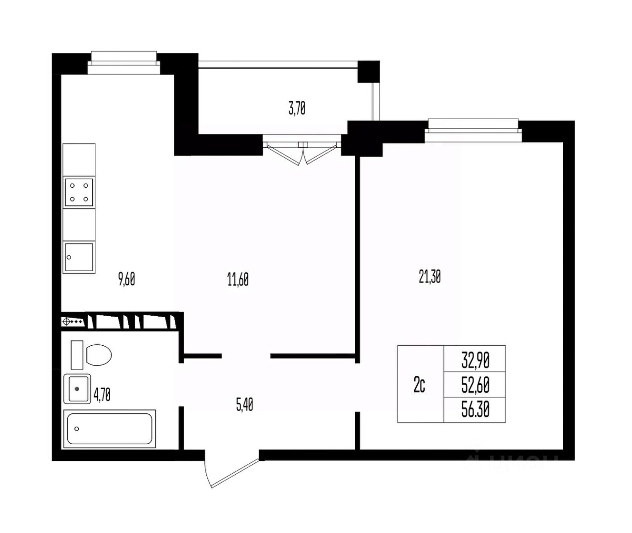 Квартира свободной планировки, 56,3 м²
