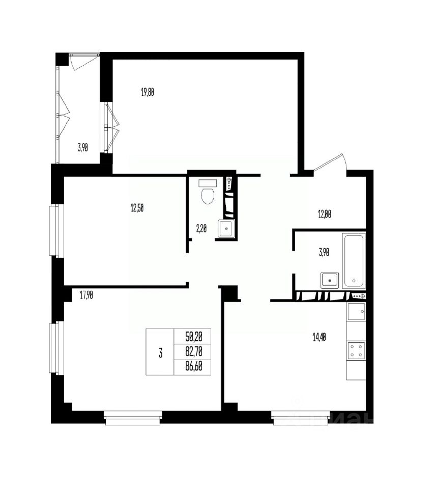 Квартира свободной планировки, 86,6 м²