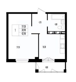 Квартира свободной планировки, 42,9 м²