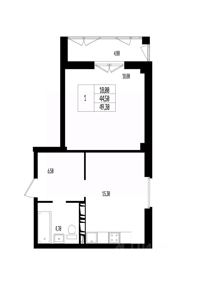 Квартира свободной планировки, 49,3 м²