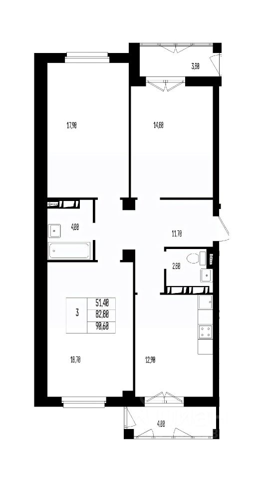 Квартира свободной планировки, 90,6 м²