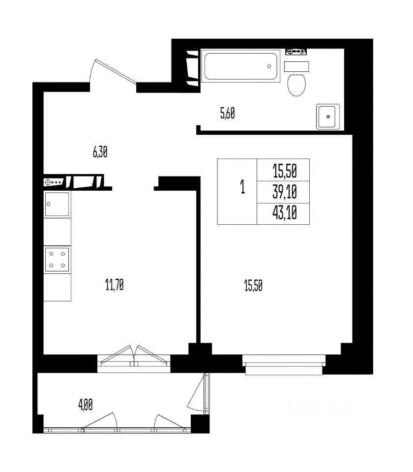 Квартира свободной планировки, 43,1 м²