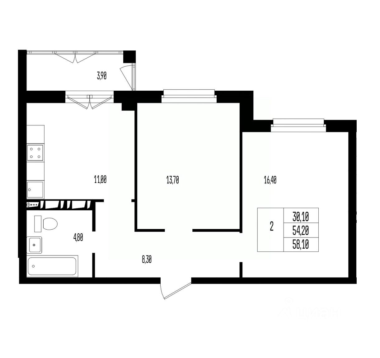 Общая площадь58,1 м²