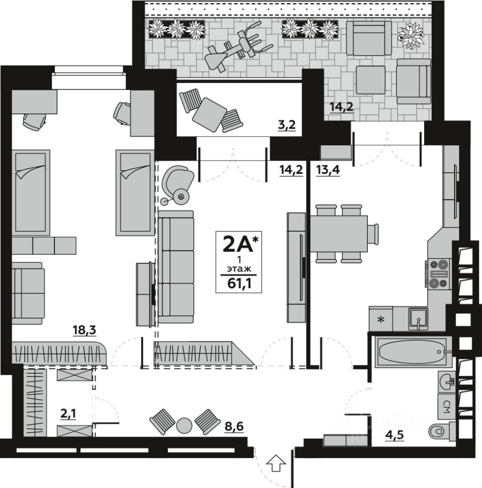 Общая площадь61,18 м²