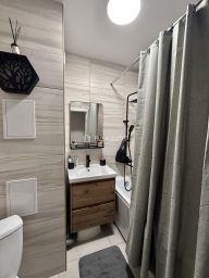 Изолированные комнаты с окнами на улицу идеально подходят для семейного проживания. Квартира оснащена центральным отоплением, а в доме предусмотрена наземная парковка.