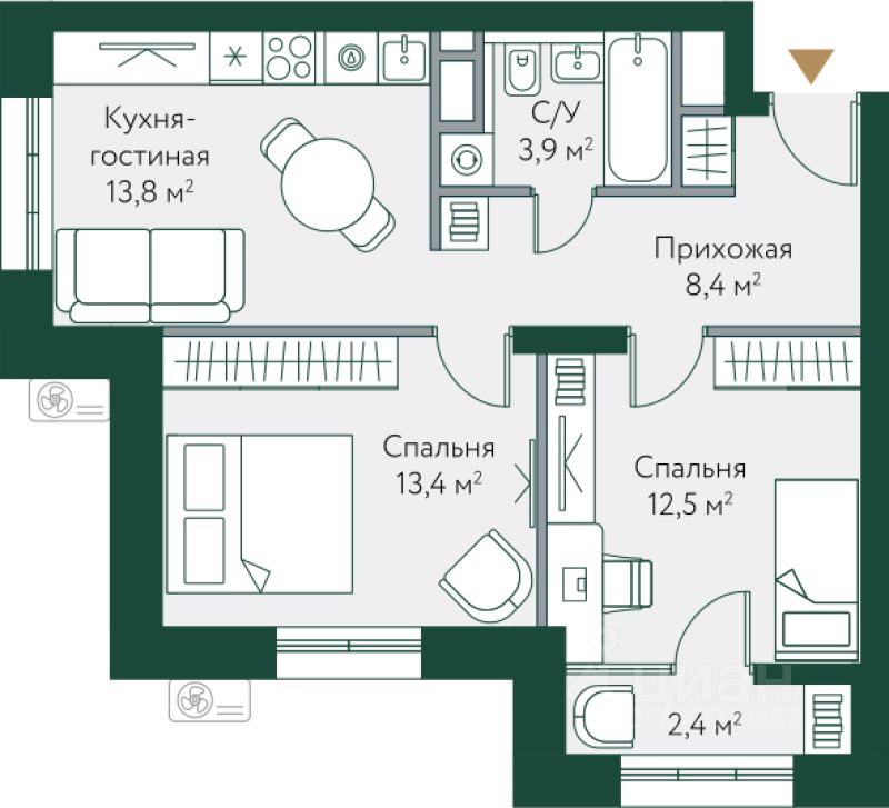54,4 м²