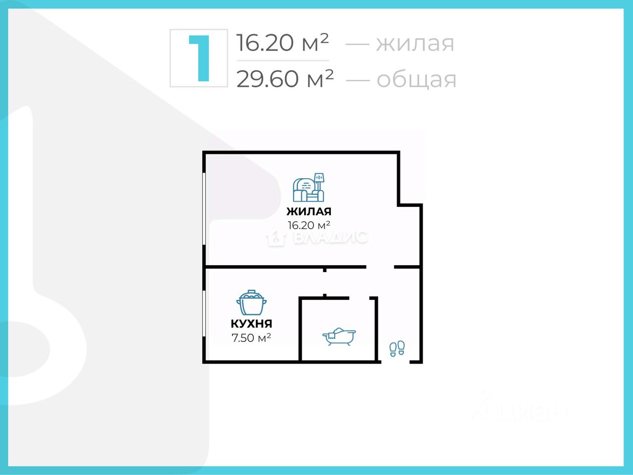 Планировка: общая площадь 29.6 / жилая 16.2 / 7.5 кв. метров.