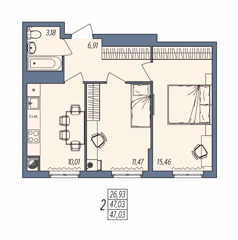 Общая площадь47,03 м²