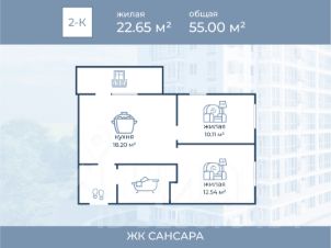 Общая площадь с балконом составляет 55.00 м²