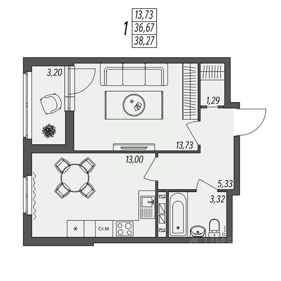 Общая площадь38,27 м²