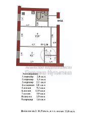 Общая площадь - 42 кв.м, площадь кухни - 6 кв.м. Комнаты раздельные - 9 кв.м. и 14 кв.м.