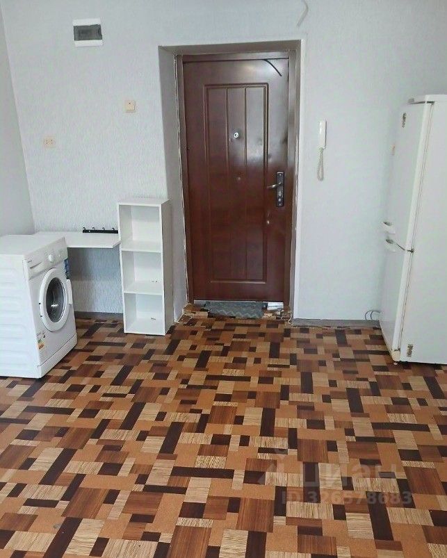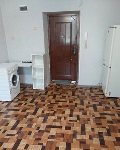 Качественный ремонт, комната в отличном состоянии. Натяжной потолок, пластиковое окно, на полу линолеум. Диван, кресло, холодильник, стиральная машинка (новая). Интернет кабель. На этаже установлена железная входная дверь с домофоном. Общая кухня: стол, плита. Санузел на этаже раздельный: мужской и женский.