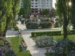 Проектом запланированы торгово-офисные и коммерческие помещения на первых этажах домов, что позволит организовать и развивать собственную дополнительную инфраструктуру района: мини-маркеты, булочные, детские клубы, салоны красоты, фитнес и т.п.
