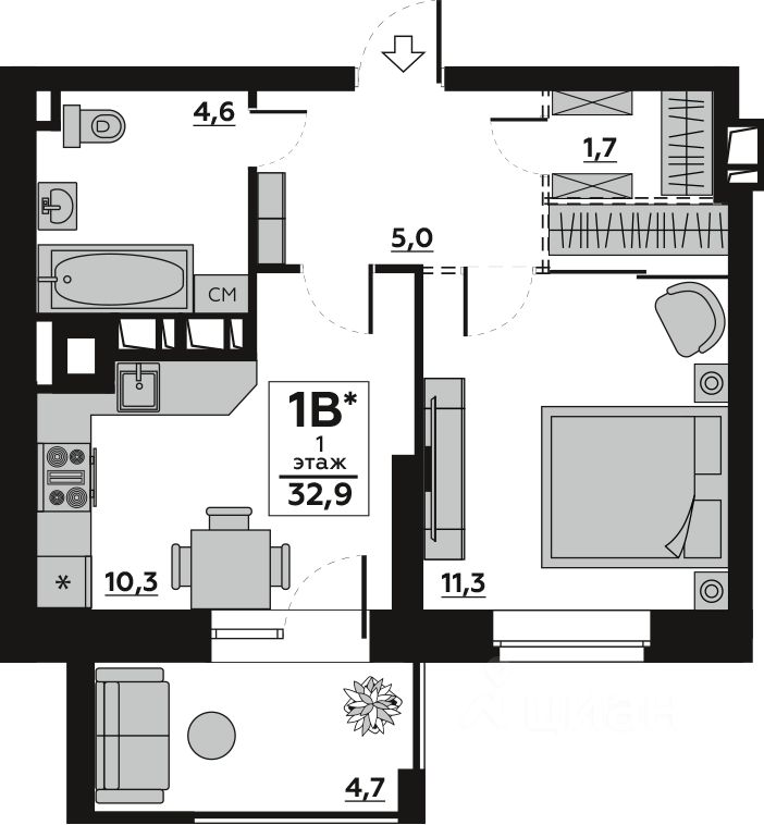 Общая площадь32,91 м²