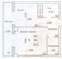 Продается 1-к квартира в ЖК Вершина по адресу: поселок Стройдеталь, 13 в Советском районе. Планировка: общая площадь 39.2 м², жилая площадь 16.1 м², кухня 10.1 м².