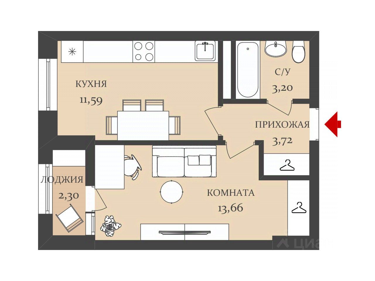 Общая площадь - 33.2м2