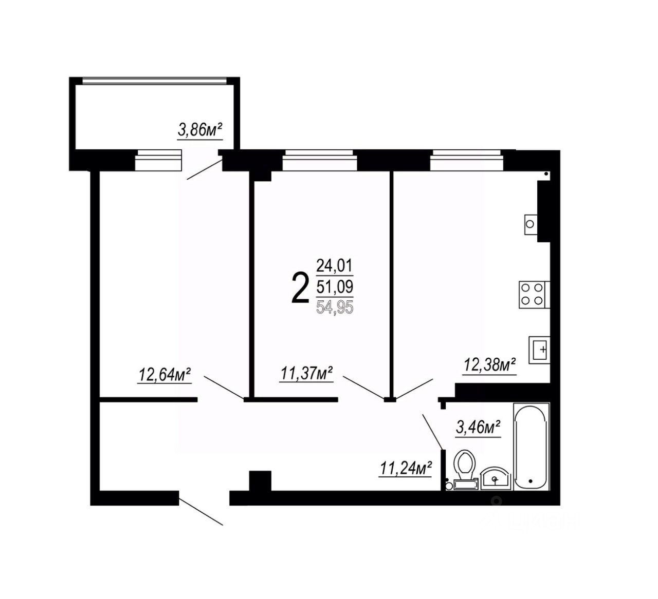 Общая площадь54,95 м²