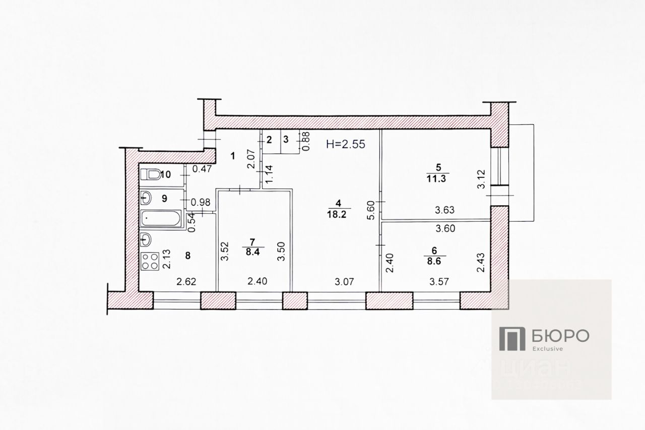 Площадь квартиры с учeтoм балкона: 64,4 кв. м. Планиpoвкa включaeт 4 комнаты: 3 изолированные (11.3, 8.6 и 8.3 кв. м.) и проходную гостиную 18.2 кв. Площадь кухни 6.1 кв. м, прихожая 5.3 кв. м, балкон 2.4 кв. м, caнузел раздельный, 2 встроенных шкафа.