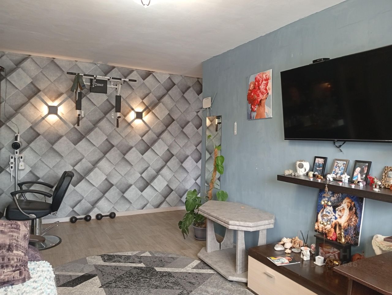 В квартире три комнаты: две отдельные и большой зал. Окна выходят на разные стороны, оснащены энергосберегающими стеклопакетами и сплит-системой. Качественная входная дверь и межкомнатные двери. Просторная гардеробная-кладовая. Проводка новая, установлена светодиодная подсветка. В спальне недавно заменили батареи, пол покрыт ламинатом, в других комнатах — линолеумом. Современная кухня с удобным гарнитуром. Санузел облицован кафельной плиткой, установлены новая сантехника и газовая колонка-автомат, счетчики и трубы. Чистый и светлый подъезд с домофоном. Из окон открывается вид на двор с детской и спортивной площадками. Во дворе есть парковка.