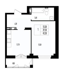 Квартира свободной планировки, 43,1 м²
