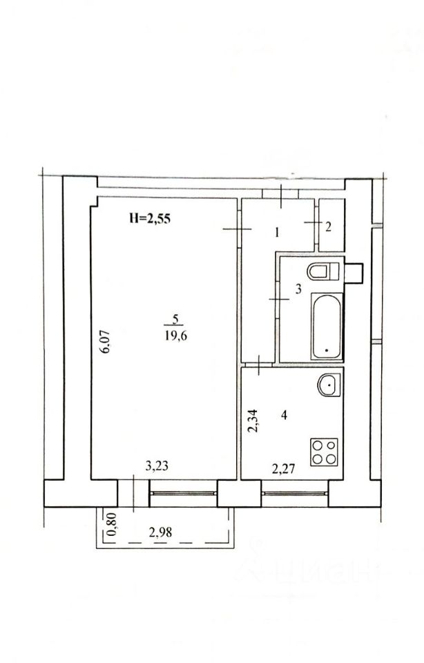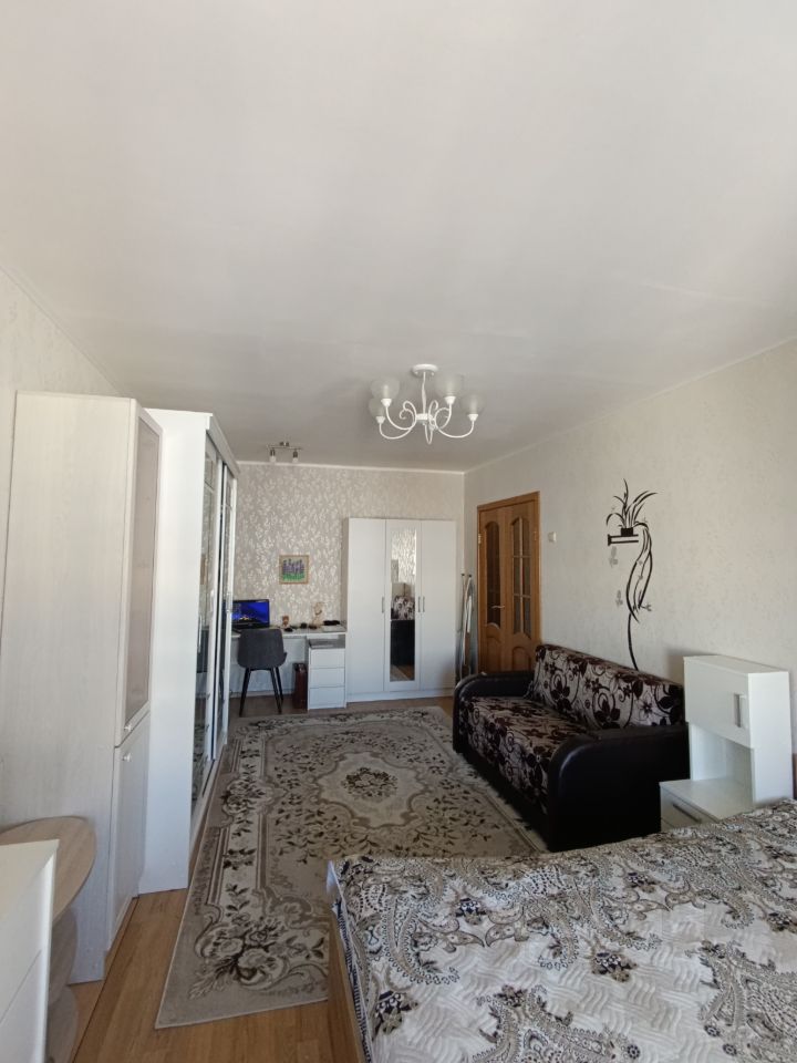 Квартира, находится на 9-ом этаже 9-ти этажного кирпичного дома, уд68 года постройки, имеет общую площадью-33 м² ( + площадь балкона-0.7), 19,8 м²- жилая площадь, кухня-5,3 м²., с/у совмещен, есть просторный шкаф.