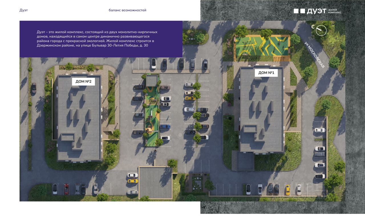Новый жилой комплекс в Дзержинском районе. Два 18-этажных дома на благоустроенной территории создают особый ансамбль — "ДУЭТ", в котором хочется жить активной жизнью.