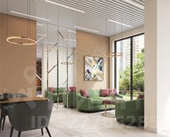 1й этаж с комьюнити-зоной, ресепшеном, и местами для работы и общения