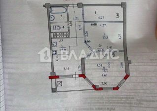Общая площадь квартиры — 63,1 кв. м, жилая — 31,4 кв. м, площадь кухни — 15 кв. м. Комнаты изолированы, их площадь — 16,1 и 15,3 кв. м.
