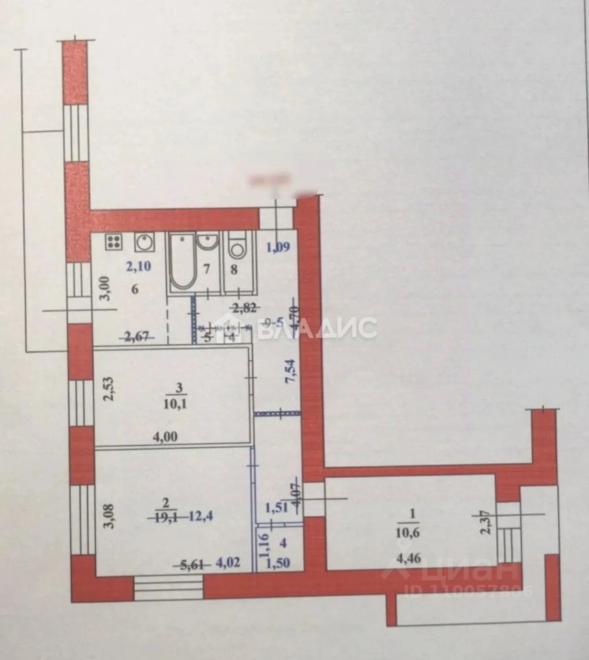 Квартира расположена на 9 этаже и имеет общую площадь 61,4 кв. м, из которых 33,1 кв. м — жилая площадь, комнаты — 10,6+12,4+10,1 кв. м, кухня — 7 кв. м. Высота потолков — 2,6 м.