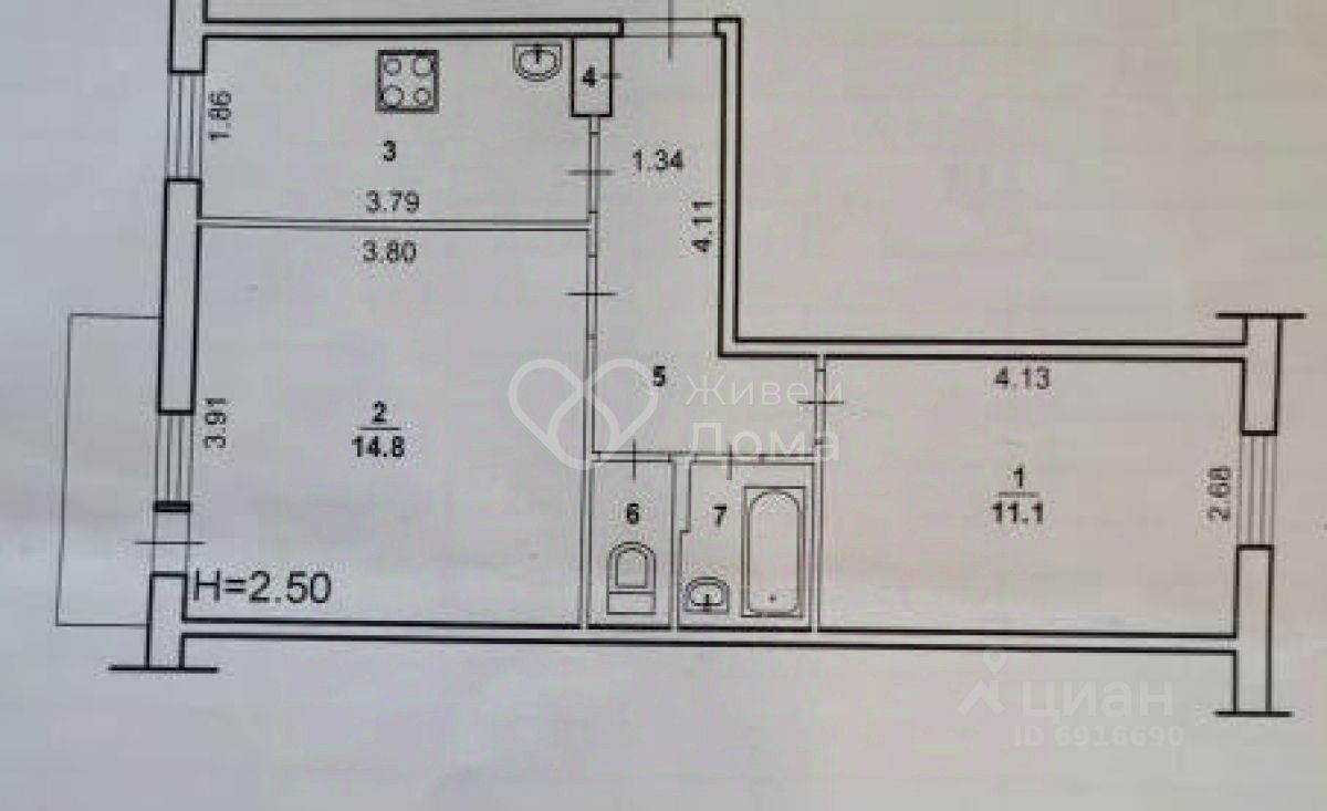 Планировка: общая 42.70 / жилая 25.90 / кухня 6.80