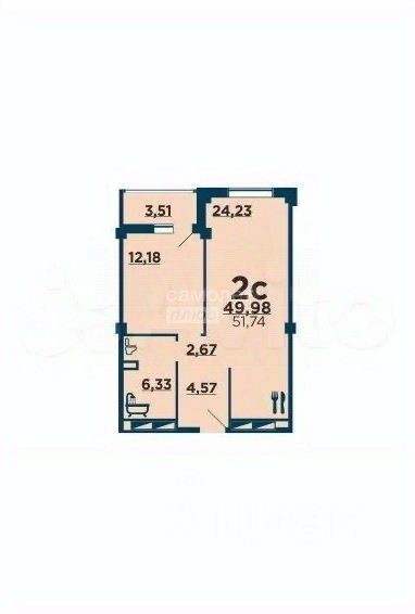 • Комнаты: гостиная 24 м² (объединена с кухней), изолированная спальня 12 м²