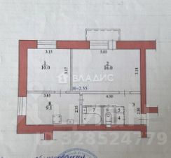 Площадь: общая 44,9 кв. м, жилая 26 кв. м, комнаты раздельные 16 и 10 кв. м, кухня 9,1 кв. м.