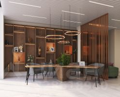 1й этаж с комьюнити-зоной, ресепшеном, и местами для работы и общения