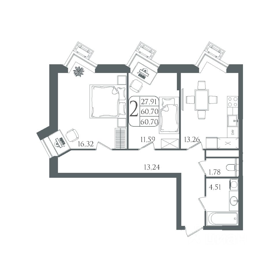 Общая площадь60,7 м²