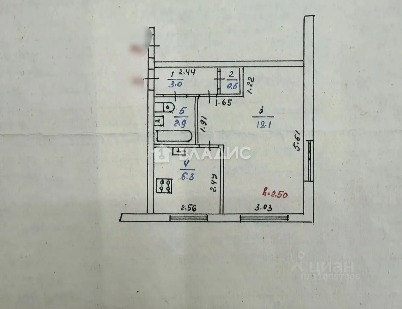 Общая площадь составляет 31 кв. м, из которых 18,1 кв. м — жилая площадь, 6,3 кв. м — кухня.