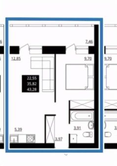 Квартира расположена на 9 этаже 10 этажного. Общая площадь квартиры 43.3 кв.м. В квартире удобная планировка: кухня-гостиная 13 кв.м, комната 10 кв.м, санузел 4 кв.м, просторный коридор с нишей под шкаф-купе, лоджия 7.5 кв.м.