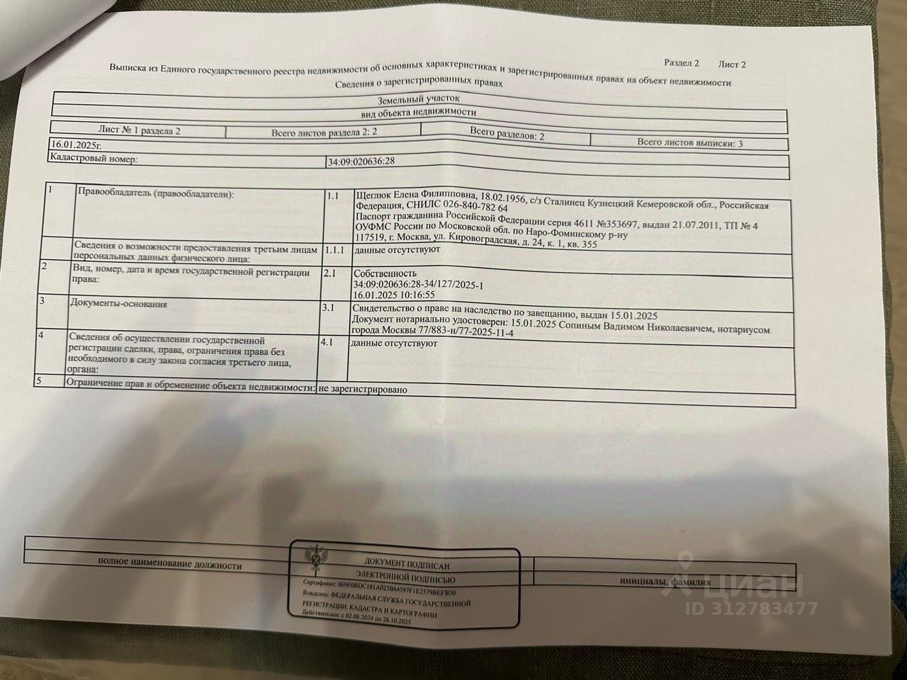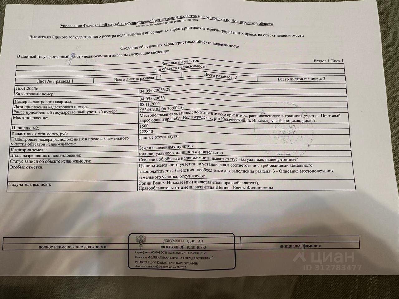 Кадастровый номер участка 34:09:020636:*** указал продавец