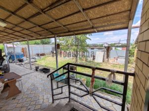 От выхода из дома до забора большой навес, заезд под машину, выложен брусчаткой.