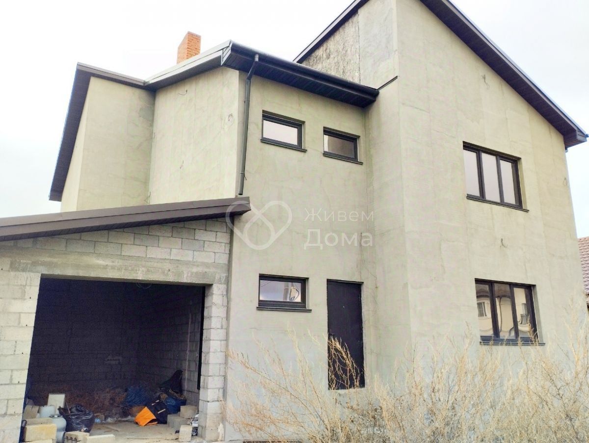 Гараж. Дом построен из шлакоблока, утеплитель — базальтовое волокно, фасад — мокрая штукатурка. Мягкая кровля. Стеклопакеты с зеркальной тонировкой.