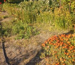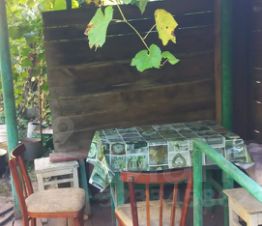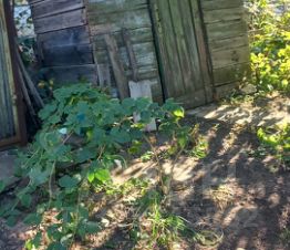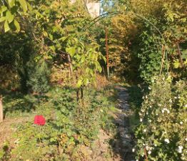На участке растут деревья - яблоня, груша, орехи 2 сорта, а также виноград 4 сорта, смородина разноцветная, машина, клубника, цветы.
