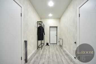 Интерьер дома в светлых, приятных тонах. На полу керамогранит с водяным отоплением, на стенах обои, потолок натяжной, качественные межкомнатные двери и надежная входная металлическая дверь.