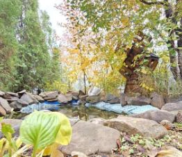 Отдельно стоит отметить двухэтажную дровяную баню: на первом этаже парилка, помывочная, санузел,зона отдыха, на втором - просторная спальня.