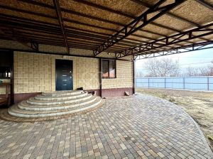 Во дворе выложена брусчатка, засеян газон, посажены различные деревья - черешня, груша, персик, инжир, малина, ежевика и др, есть мангал. Есть место для парковки.