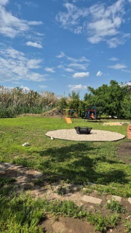 Участок: Газон, плодовые деревья (2 вишни, 2 абрикоса, 2 ореха, груша, тутовник, слива), ягоды (малина, клубника). Обустроена зона для костра.