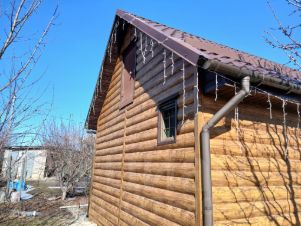 Материал дома - блок+утеплитель+кирпич, баня - блок+утеплитель+металлический фасад под "брус".