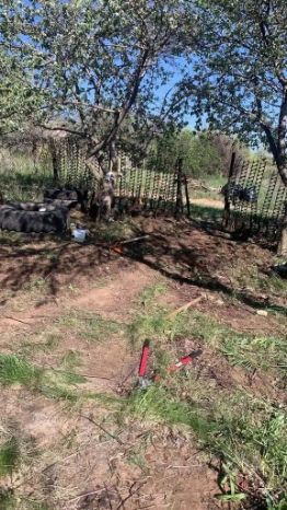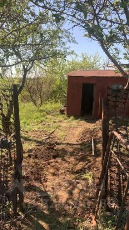 На участке плодовые деревья, сарайчик, старое ограждение.