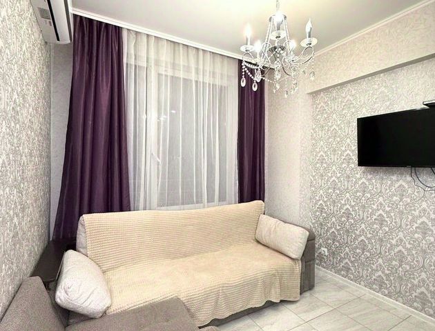 Просторная студия с видом на город, большой смарт-телевизор, дизайнерский ремонт, в квартире удобный диван и двуспальная кровать
