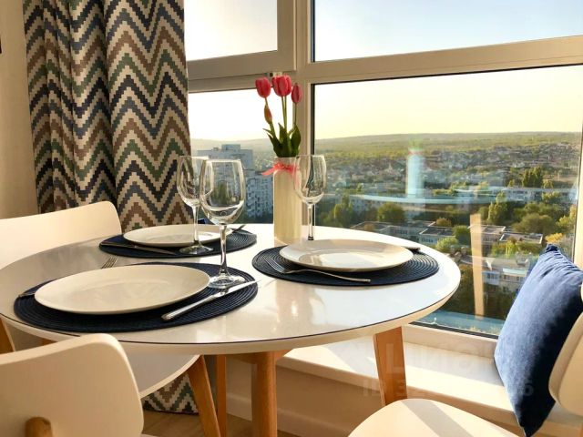 Просторная студия с видом на город, большой смарт-телевизор, дизайнерский ремонт, в квартире удобный диван и двуспальная кровать